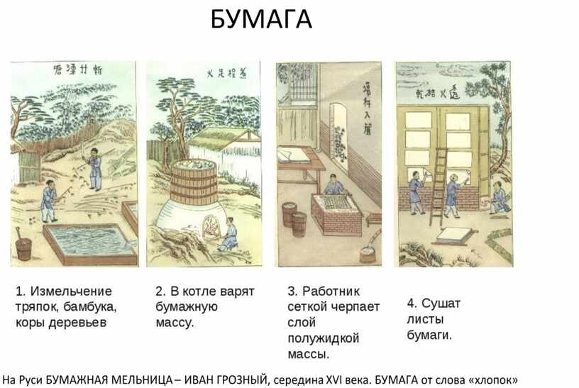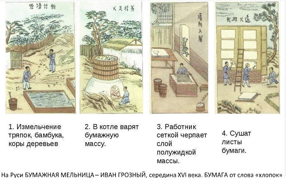 На Руси БУМАЖНАЯ МЕЛЬНИЦА – ИВАН ГРОЗНЫЙ, середина XVI века. БУМАГА от слова «хлопок»