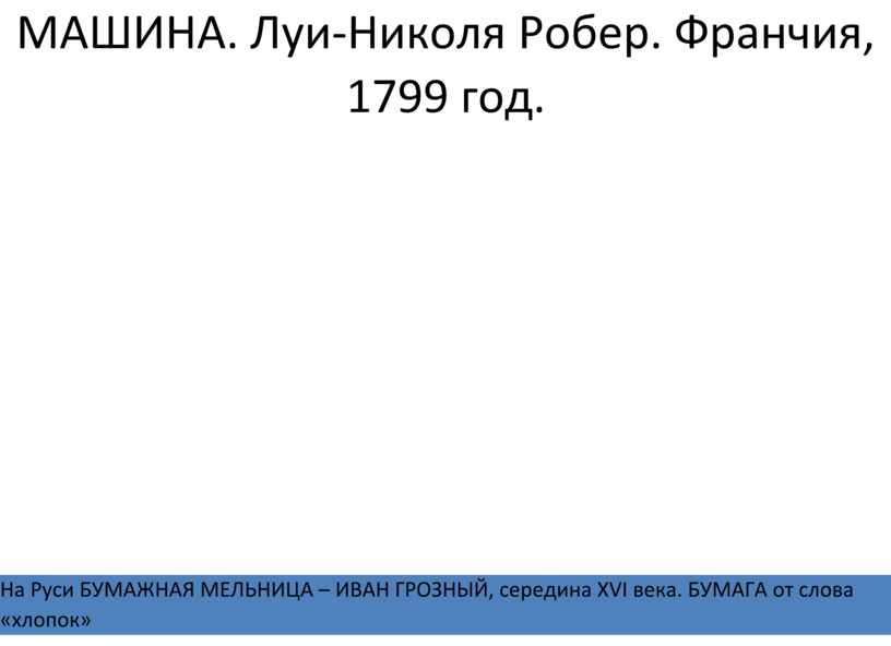 БУМАГОДЕЛАТЕЛЬНАЯ МАШИНА. Луи-Николя Робер. Франчия, 1799 год.