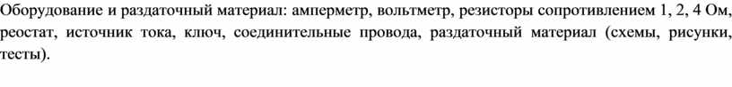 Оборудование и раздаточный материал: амперметр, вольтметр, резисторы сопротивлением 1, 2, 4 Ом, реостат, источник тока, ключ, соединительные провода, раздаточный материал (схемы, рисунки, тесты).