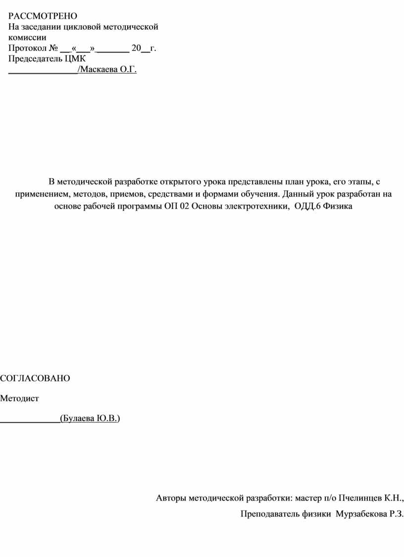 РАССМОТРЕНО На заседании цикловой методической комиссии Протокол № __ «___» _______ 20__г. Председатель ЦМК _______________/Маскаева О.Г. |