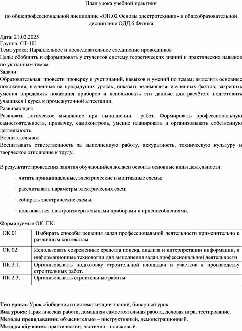 В методической разработке открытого урока представлены план урока, его этапы, с применением, методов, приемов, средствами и формами обучения. Данный урок разработан на основе рабочей программы ОП 02 Основы электротехники, ОДД.6 Физика