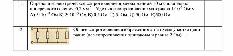 Определите электрическое сопротивление провода длиной 10 м с площадью поперечного сечения 0,2 мм 2 . Удельное сопротивление материала 1∙10-5 Ом·м А) 5∙ 10 –4 Ом Б) 2∙ 10 –5 Ом В) 0,5 Ом Г) 5 Ом Д) 50 Ом Е)500 Ом |