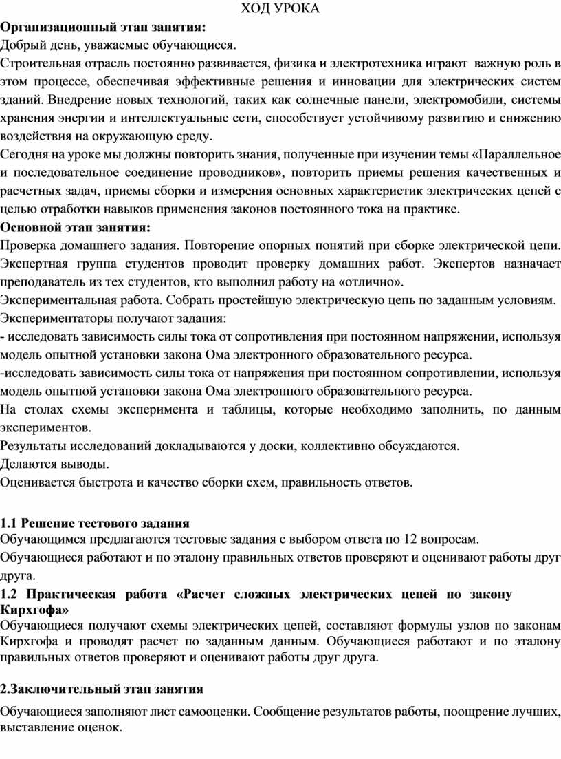 Обучающиеся получают схемы электрических цепей, составляют формулы узлов по законам Кирхгофа и проводят расчет по заданным данным. Обучающиеся работают и по эталону правильных ответов проверяют и оценивают работы друг друга.