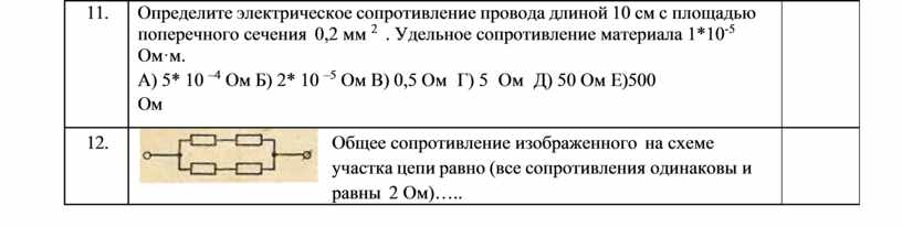 Определите электрическое сопротивление провода длиной 10 см с площадью поперечного сечения 0,2 мм 2 . Удельное сопротивление материала 1*10-5 Ом·м. А) 5* 10 –4 Ом Б) 2* 10 –5 Ом В) 0,5 Ом Г) 5 Ом Д) 50 Ом Е)500 Ом |