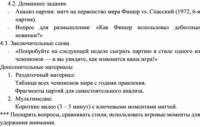 Методы подачи: Рассказ, визуализация (шахматная доска, видеофрагменты), интерактивные вопросы.
