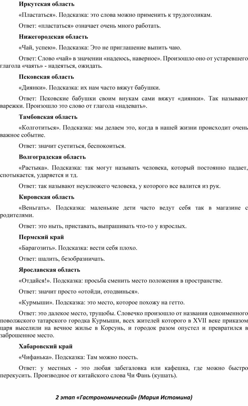 Итак, сейчас вы услышите слово и часть страны, где оно употребляется. Ваша задача объяснить его значение. Если идей нет, то вы можете воспользоваться подсказкой, но она снимет пол балла за правильный ответ. Чем больше слов вы сможете назвать, тем больше победных очков получите.