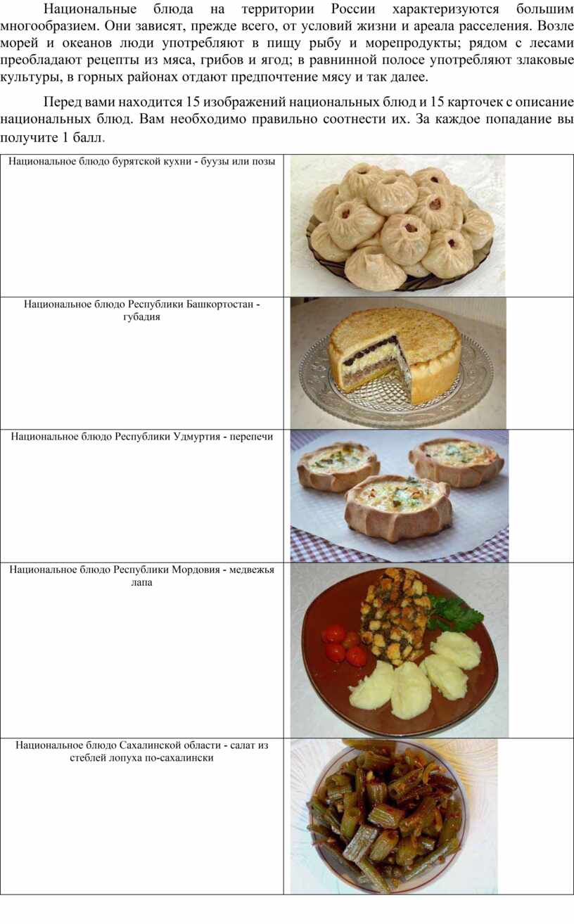 Перед вами находится 15 изображений национальных блюд и 15 карточек с описание национальных блюд. Вам необходимо правильно соотнести их. За каждое попадание вы получите 1 балл.