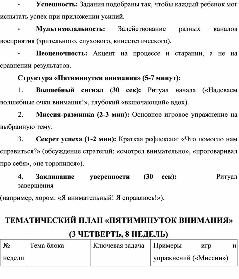 1. Волшебный сигнал (30 сек): Ритуал начала («Надеваем волшебные очки внимания!», глубокий «включающий» вдох).