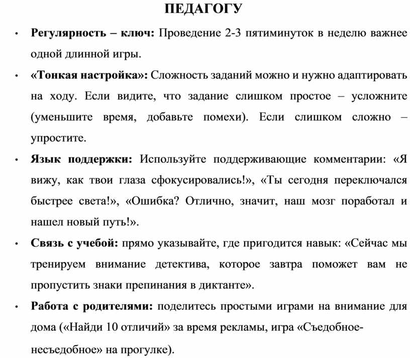 • Работа с родителями: поделитесь простыми играми на внимание для дома («Найди 10 отличий» за время рекламы, игра «Съедобное-
