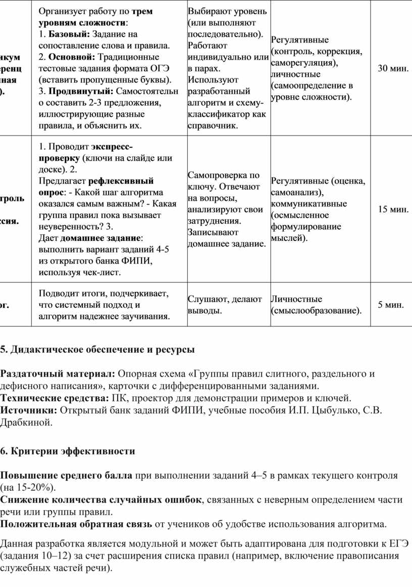 Организует работу по трем уровням сложности: 1. Базовый: Задание на сопоставление слова и правила. 2. Основной: Традиционные тестовые задания формата ОГЭ (вставить пропущенные буквы). 3. Продвинутый: Самостоятельно составить 2-3 предложения, иллюстрирующие разные правила, и объяснить их. |