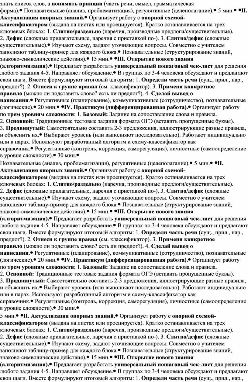 Организует работу с опорной схемой-классификатором (выдана на листах или проецируется). Кратко останавливается на трех ключевых блоках: 1. Слитно/раздельно (наречия, производные предлоги/существительные). 2. Дефис (сложные прилагательные, наречия с приставкой по-). 3. Слитно/дефис (сложные существительные). |