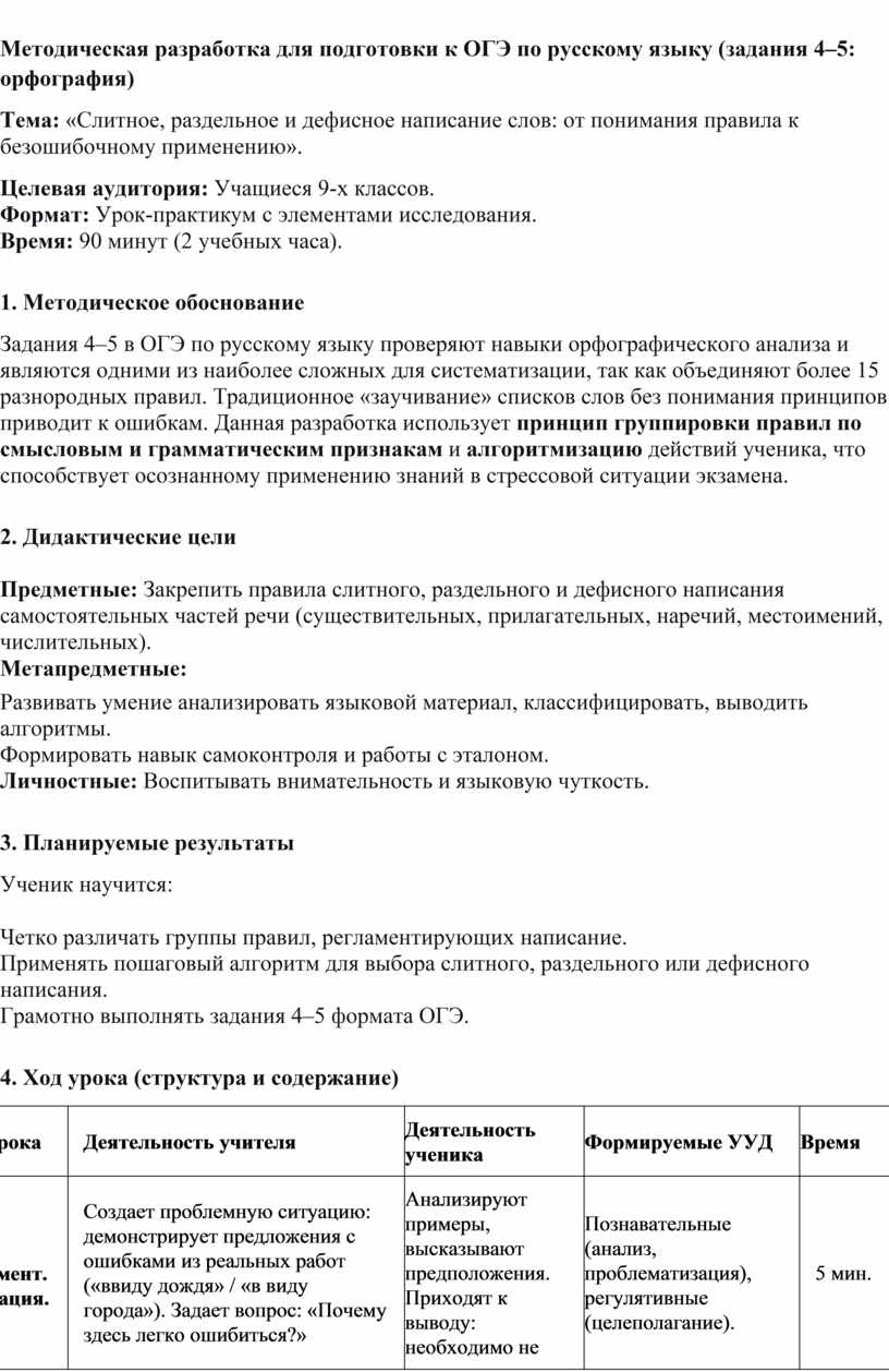 Задания 4–5 в ОГЭ по русскому языку проверяют навыки орфографического анализа и являются одними из наиболее сложных для систематизации, так как объединяют более 15 разнородных правил. Традиционное «заучивание» списков слов без понимания принципов приводит к ошибкам. Данная разработка использует принцип группировки правил по смысловым и грамматическим признакам и алгоритмизацию действий ученика, что способствует осознанному применению знаний в стрессовой ситуации экзамена.