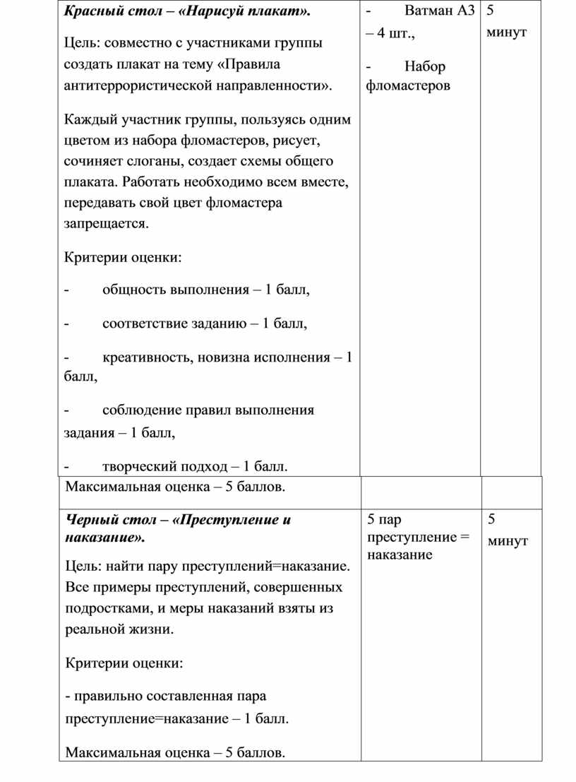Красный стол – «Нарисуй плакат». Цель: совместно с участниками группы создать плакат на тему «Правила антитеррористической направленности». Каждый участник группы, пользуясь одним цветом из набора фломастеров, рисует, сочиняет слоганы, создает схемы общего плаката. Работать необходимо всем вместе, передавать свой цвет фломастера запрещается. Критерии оценки: - общность выполнения – 1 балл, - соответствие заданию – 1 балл, - креативность, новизна исполнения – 1 балл, - соблюдение правил выполнения задания – 1 балл, - творческий подход – 1 балл. |
