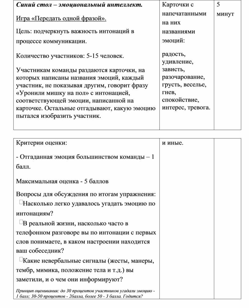 Синий стол – эмоциональный интеллект. Игра «Передать одной фразой». Цель: подчеркнуть важность интонаций в процессе коммуникации. Количество участников: 5-15 человек. Участникам команды раздаются карточки, на которых написаны названия эмоций, каждый участник, не показывая другим, говорит фразу «Уронили мишку на пол» с интонацией, соответствующей эмоции, написанной на карточке. Остальные отгадывают, какую эмоцию пытался изобразить участник. |
