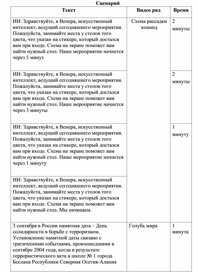 ИИ: Здравствуйте, я Венера, искусственный интеллект, ведущий сегодняшнего мероприятия. Пожалуйста, занимайте места у столов того цвета, что указан на стикере, который достался вам при входе. Схема на экране поможет вам найти нужный стол. Наше мероприятие начнется через 5 минут |