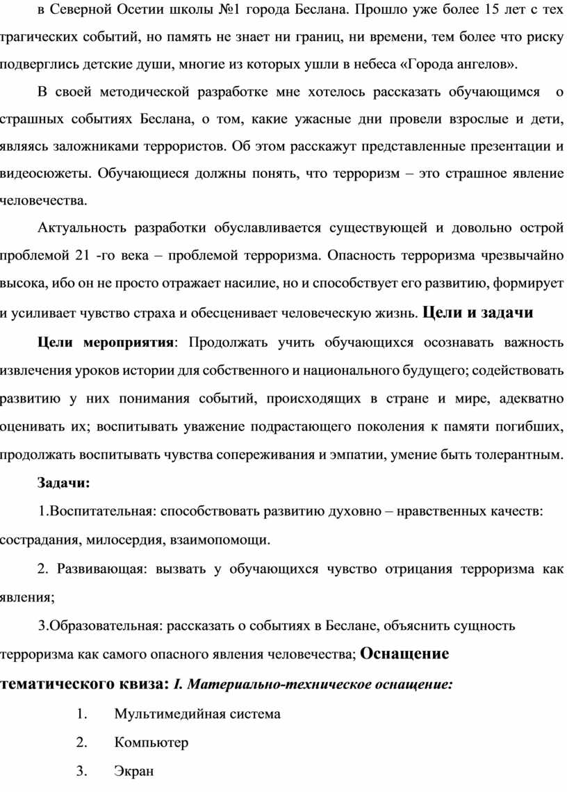 3.Образовательная: рассказать о событиях в Беслане, объяснить сущность терроризма как самого опасного явления человечества; Оснащение тематического квиза: I. Материально-техническое оснащение: