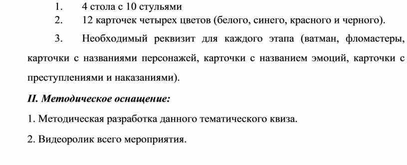6. Необходимый реквизит для каждого этапа (ватман, фломастеры, карточки с названиями персонажей, карточки с названием эмоций, карточки с преступлениями и наказаниями).