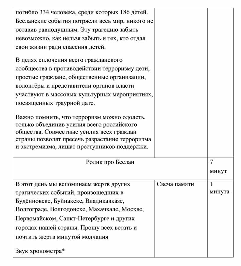 В этот день мы вспоминаем жертв других трагических событий, произошедших в Будённовске, Буйнакске, Владикавказе, Волгограде, Волгодонске, Махачкале, Москве, Первомайском, Санкт-Петербурге и других городах нашей страны. Прошу всех встать и почтить жертв минутой молчания Звук хронометра* |