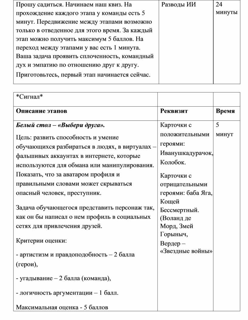 Белый стол – «Выбери друга». Цель: развить способность и умение обучающихся разбираться в людях, в виртуалах – фальшивых аккаунтах в интернете, которые используются для обмана или манипулирования. Показать, что за аватаром профиля и правильными словами может скрываться опасный человек, преступник. Задача обучающегося представить персонаж так, как он бы написал о нем профиль в социальных сетях для привлечения друзей. Критерии оценки: - артистизм и правдоподобность – 2 балла (герои), - угадывание – 2 балла (команда), - логичность аргументации – 1 балл. Максимальная оценка - 5 баллов |