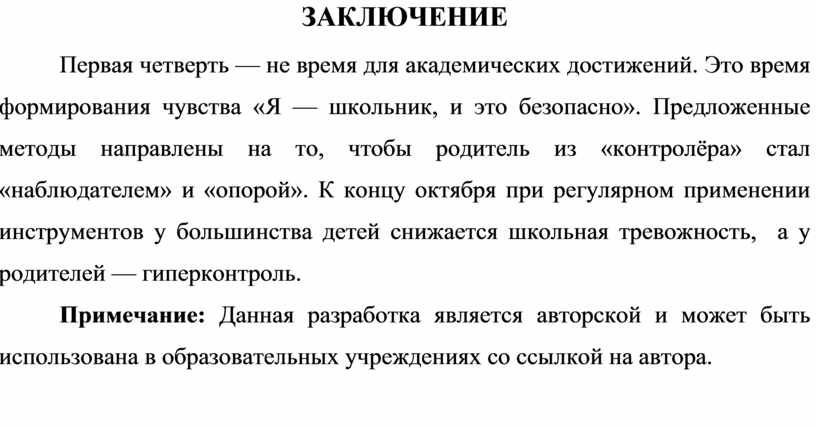 Первая четверть — не время для академических достижений. Это время формирования чувства «Я — школьник, и это безопасно». Предложенные методы направлены на то, чтобы родитель из «контролёра» стал «наблюдателем» и «опорой». К концу октября при регулярном применении инструментов у большинства детей снижается школьная тревожность, а у родителей — гиперконтроль.