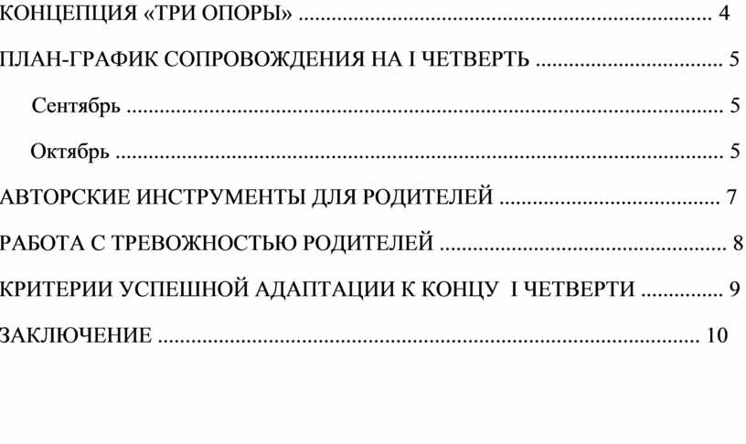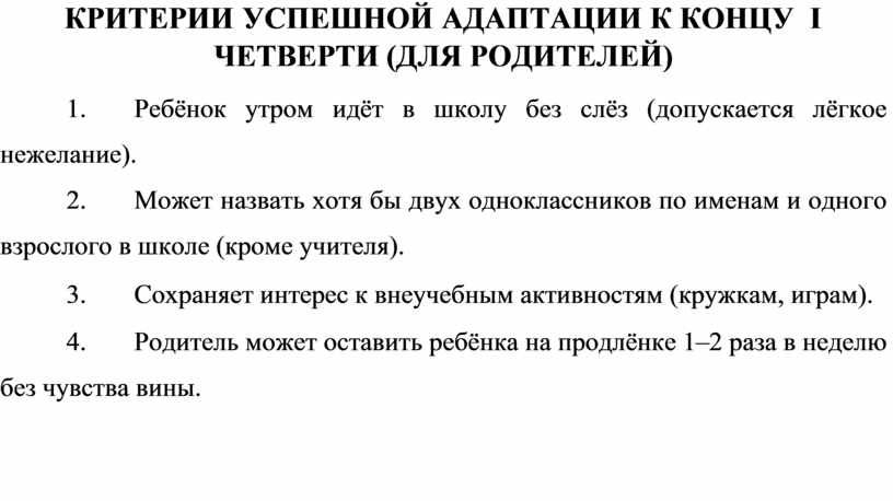 КРИТЕРИИ УСПЕШНОЙ АДАПТАЦИИ К КОНЦУ I ЧЕТВЕРТИ ............... 9
