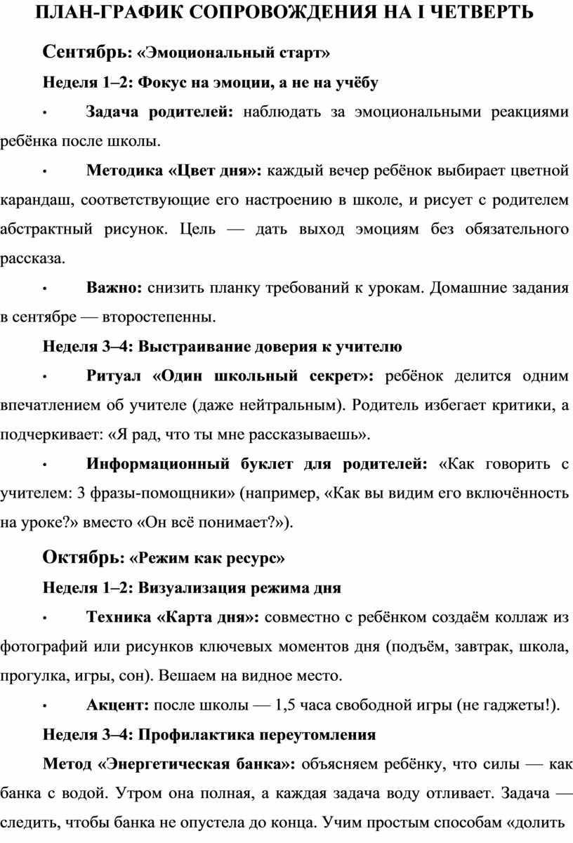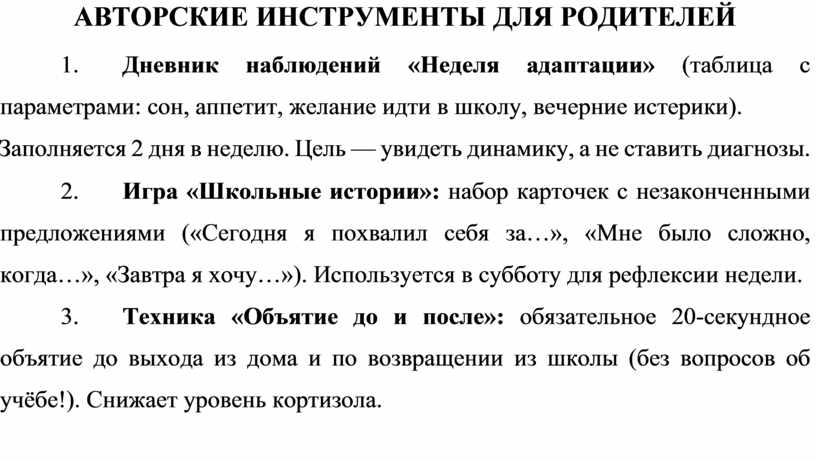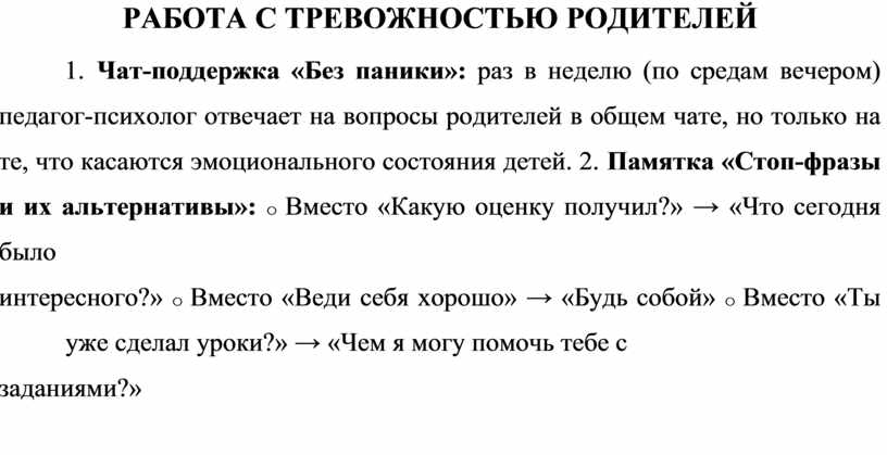 1. Чат-поддержка «Без паники»: раз в неделю (по средам вечером) педагог-психолог отвечает на вопросы родителей в общем чате, но только на те, что касаются эмоционального состояния детей. 2. Памятка «Стоп-фразы и их альтернативы»: o Вместо «Какую оценку получил?» → «Что сегодня было