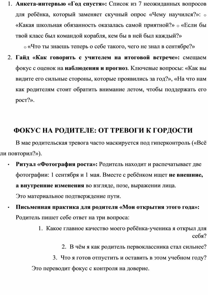 2. Анкета-интервью «Год спустя»: Список из 7 неожиданных вопросов для ребёнка, который заменяет скучный опрос «Чему научился?»: o «Какая школьная обязанность оказалась самой приятной?» o «Если бы твой класс был командой корабля, кем бы в ней был каждый?»