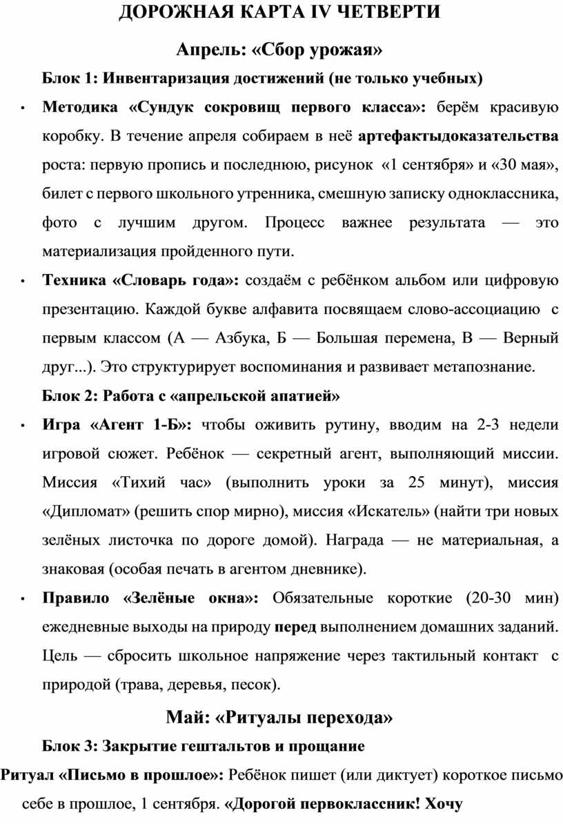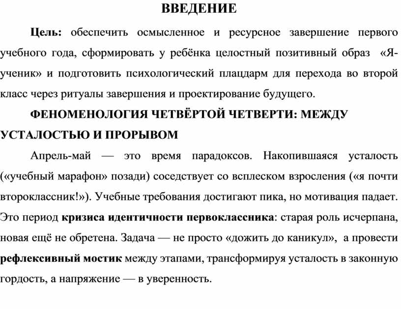 Апрель-май — это время парадоксов. Накопившаяся усталость («учебный марафон» позади) соседствует со всплеском взросления («я почти второклассник!»). Учебные требования достигают пика, но мотивация падает. Это период кризиса идентичности первоклассника: старая роль исчерпана, новая ещё не обретена. Задача — не просто «дожить до каникул», а провести рефлексивный мостик между этапами, трансформируя усталость в законную гордость, а напряжение — в уверенность.
