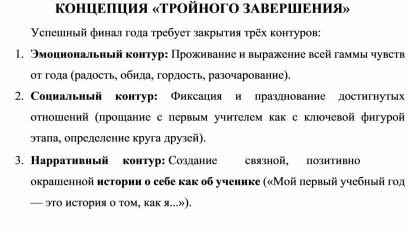 3. Нарративный контур: Создание связной, позитивно окрашенной истории о себе как об ученике («Мой первый учебный год — это история о том, как я...»).