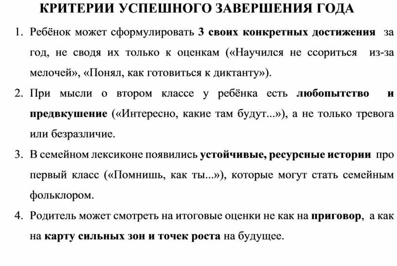 1. Ребёнок может сформулировать 3 своих конкретных достижения за год, не сводя их только к оценкам («Научился не ссориться из-за мелочей», «Понял, как готовиться к диктанту»).