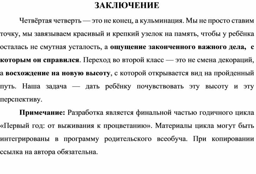 Четвёртая четверть — это не конец, а кульминация. Мы не просто ставим точку, мы завязываем красивый и крепкий узелок на память, чтобы у ребёнка осталась не смутная усталость, а ощущение законченного важного дела, с которым он справился. Переход во второй класс — это не смена декораций, а восхождение на новую высоту, с которой открывается вид на пройденный путь. Наша задача — дать ребёнку почувствовать эту высоту и эту перспективу.