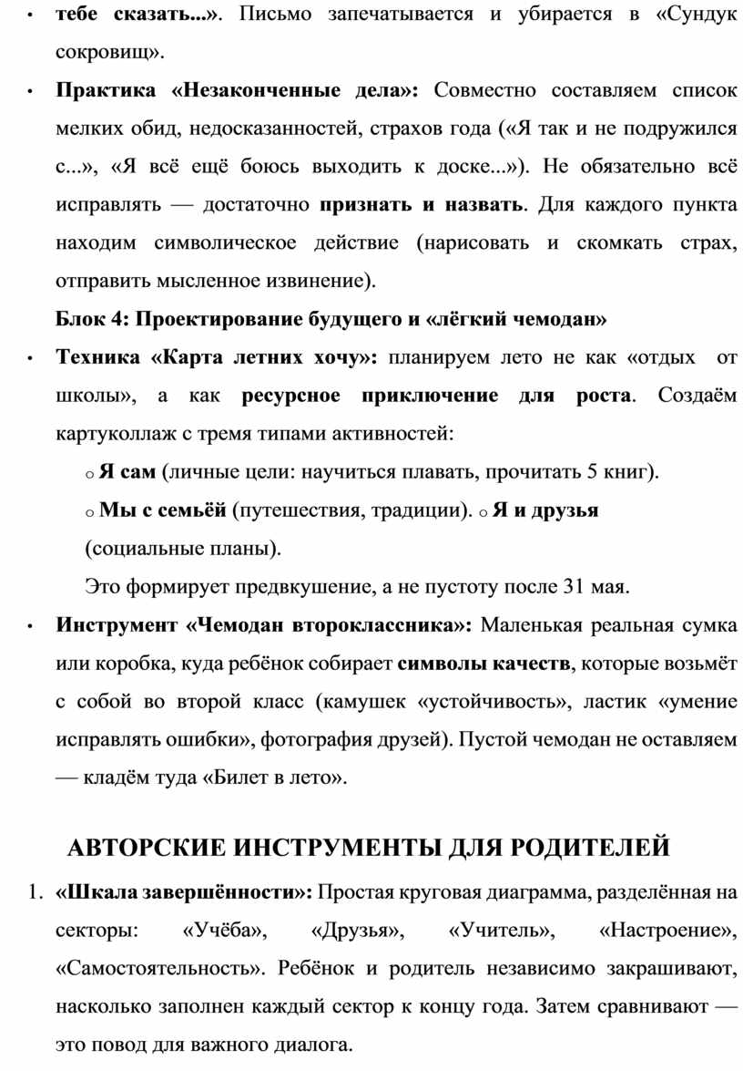 • Инструмент «Чемодан второклассника»: Маленькая реальная сумка или коробка, куда ребёнок собирает символы качеств, которые возьмёт с собой во второй класс (камушек «устойчивость», ластик «умение исправлять ошибки», фотография друзей). Пустой чемодан не оставляем — кладём туда «Билет в лето».
