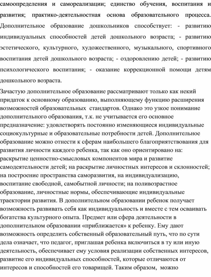 Рассматривая роль дополнительного образования в современных условиях, ученые выделяют разные его приоритетные цели. Такие видные ученые как Е.Б. Владова, Л.Г. Логинова, Н.Н. Михайлова обосновывают следующие идеи: свободный выбор ребенком видов и сфер деятельности; ориентация на личностные интересы, потребности, способности; возможность свободного самоопределения и самореализации; единство обучения, воспитания и развития; практико-деятельностная основа образовательного процесса. Дополнительное образование дошкольников способствует: - развитию индивидуальных способностей детей дошкольного возраста; - развитию эстетического, культурного, художественного, музыкального, спортивного воспитания детей дошкольного возраста; - оздоровлению детей; - развитию психологического воспитания; - оказание коррекционной помощи детям дошкольного возраста.