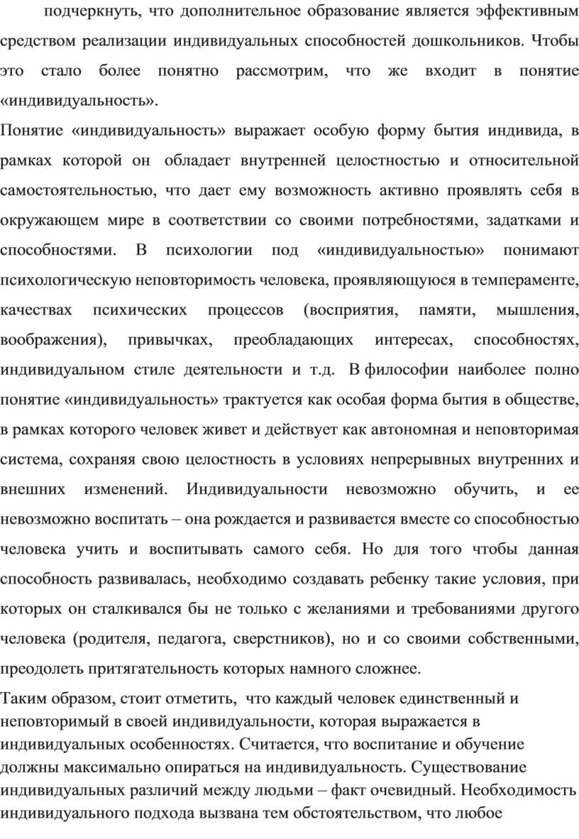 Зачастую дополнительное образование рассматривают только как некий придаток к основному образованию, выполняющему функцию расширения возможностей образовательных стандартов. Однако это узкое понимание дополнительного образования, т.к. не учитывается его основное предназначение: удовлетворять постоянно изменяющиеся индивидуальные социокультурные и образовательные потребности детей. Дополнительное образование можно отнести к сферам наибольшего благоприятствования для развития личности каждого ребенка, так как оно ориентировано на: раскрытие ценностно-смысловых компонентов мира и развитие самодеятельности детей; на раскрытие личностных интересов и склонностей; на построение пространства саморазвития, на индивидуализацию, воспитание свободной, самобытной личности; на поливозрастное образование, личностные нормы, обеспечивающие индивидуальные траектории развития. В дополнительном образовании ребенок получает возможность развивать себя как индивидуальность и вместе с тем осваивать богатства культурного опыта. Предмет или сфера деятельности в дополнительном образовании «приближается» к ребенку. Ему дают возможность определить собственный образовательный путь, что по сути дела означает, что педагог, приглашая ребенка включиться в ту или иную деятельность, обеспечивает ему условия реализации собственных интересов, развитие его индивидуальных способностей, которые отличаются от интересов и способностей его товарищей. Таким образом, можно подчеркнуть, что дополнительное образование является эффективным средством реализации индивидуальных способностей дошкольников. Чтобы это стало более понятно рассмотрим, что же входит в понятие «индивидуальность».