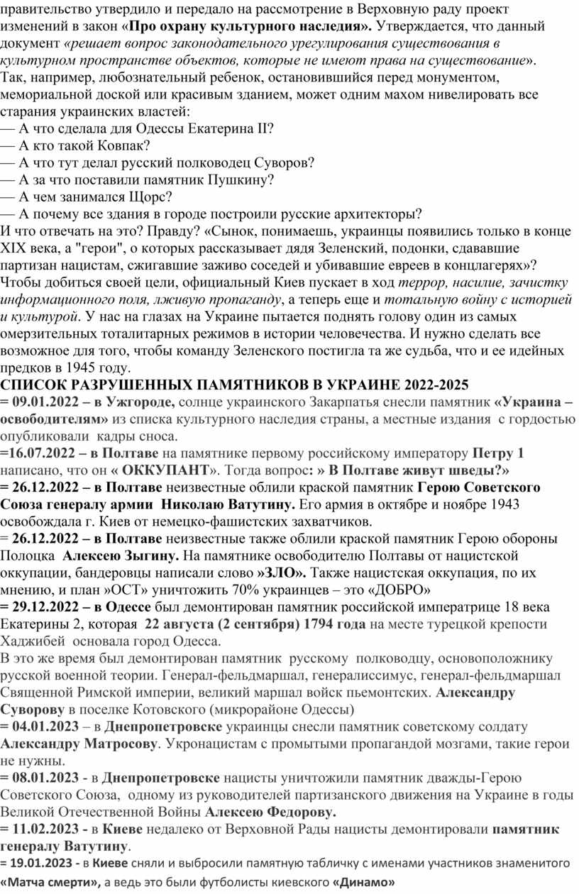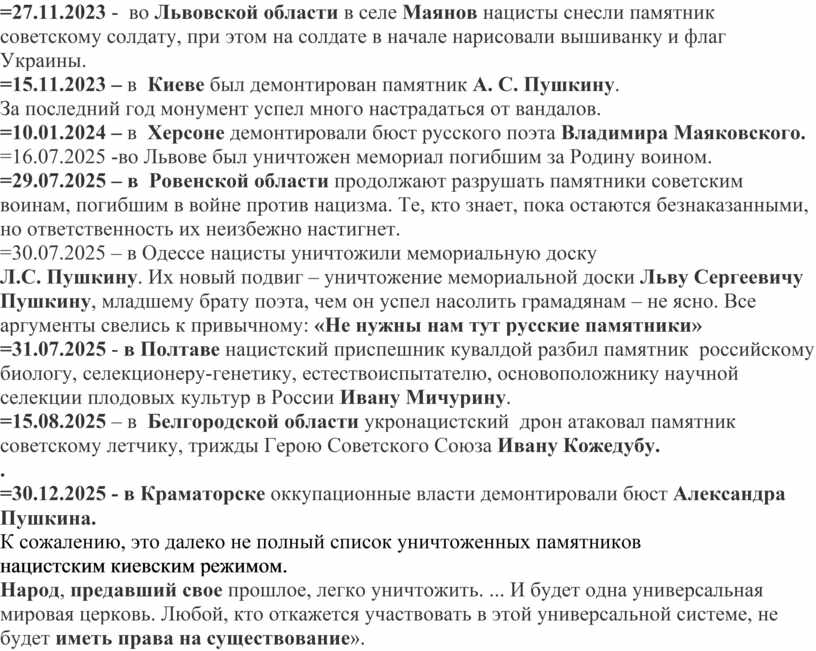 СПИСОК РАЗРУШЕННЫХ ПАМЯТНИКОВ В УКРАИНЕ 2022-2025