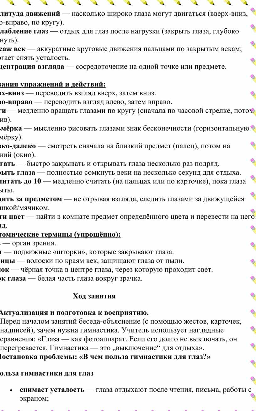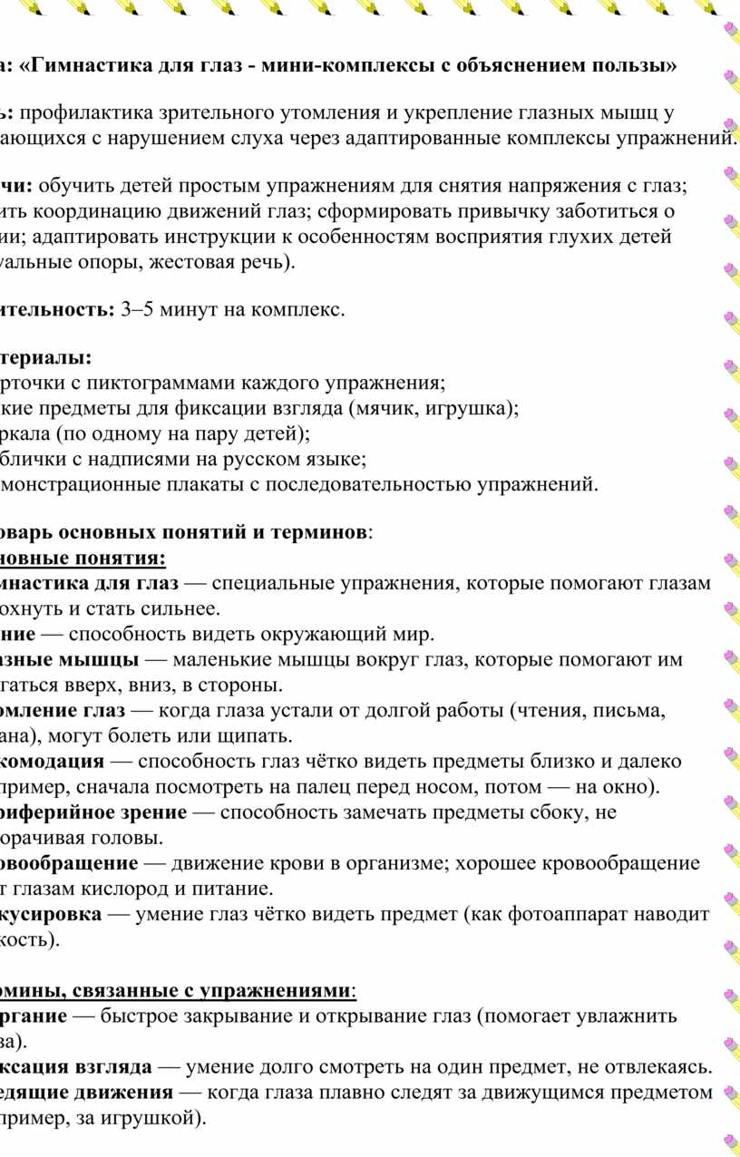 Задачи: обучить детей простым упражнениям для снятия напряжения с глаз; развить координацию движений глаз; сформировать привычку заботиться о зрении; адаптировать инструкции к особенностям восприятия глухих детей (визуальные опоры, жестовая речь).