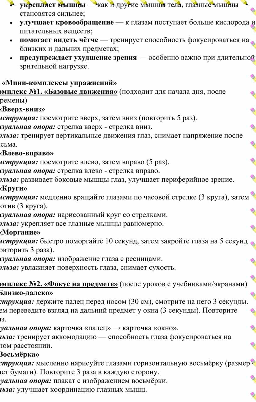 3. «Мини‑комплексы упражнений» Комплекс №1. «Базовые движения» (подходит для начала дня, после перемены) 1.«Вверх‑вниз» Инструкция: посмотрите вверх, затем вниз (повторить 5 раз). Визуальная опора: стрелка вверх - стрелка вниз. Польза: тренирует вертикальные движения глаз, снимает напряжение после письма. 2.«Влево‑вправо» Инструкция: посмотрите влево, затем вправо (5 раз). Визуальная опора: стрелка влево - стрелка вправо. Польза: развивает боковые мышцы глаз, улучшает периферийное зрение. 3.«Круги» Инструкция: медленно вращайте глазами по часовой стрелке (3 круга), затем против (3 круга). Визуальная опора: нарисованный круг со стрелками. Польза: укрепляет все глазные мышцы равномерно. 4.«Моргание» Инструкция: быстро поморгайте 10 секунд, затем закройте глаза на 5 секунд (повторить 3 раза). Визуальная опора: изображение глаза с ресницами. Польза: увлажняет поверхность глаза, снимает сухость.