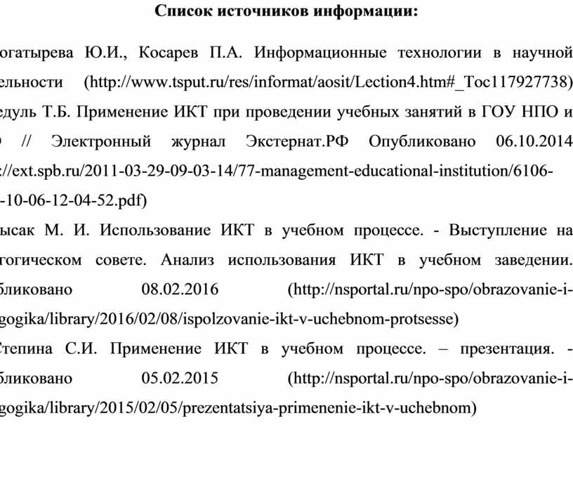 (http://nsportal.ru/npo-spo/obrazovanie-i-pedagogika/library/2016/02/08/ispolzovanie-ikt-v-uchebnom-protsesse)