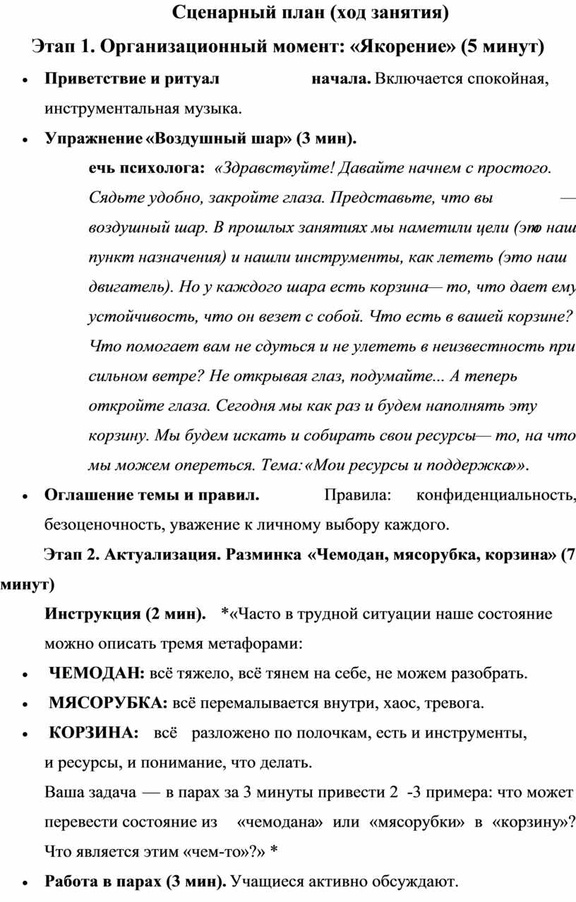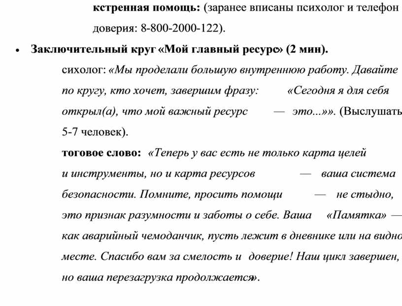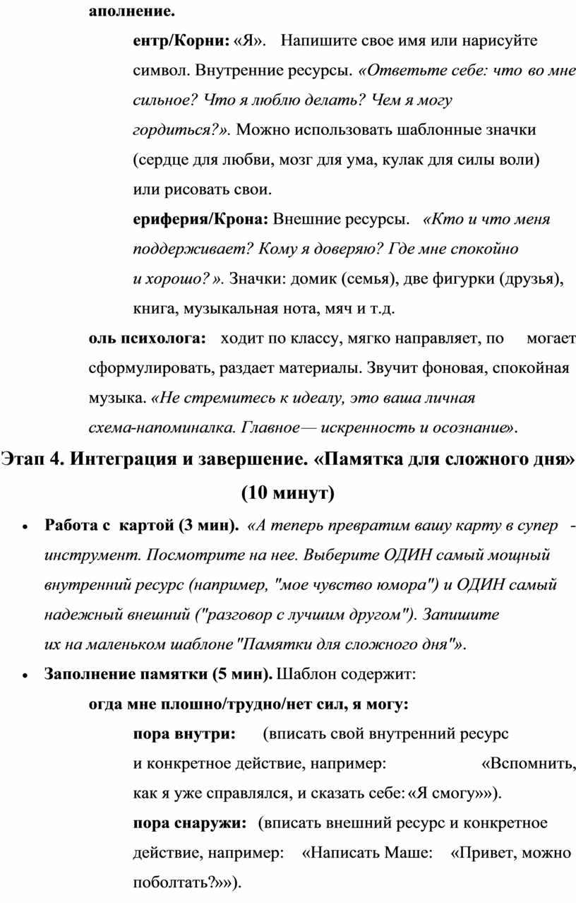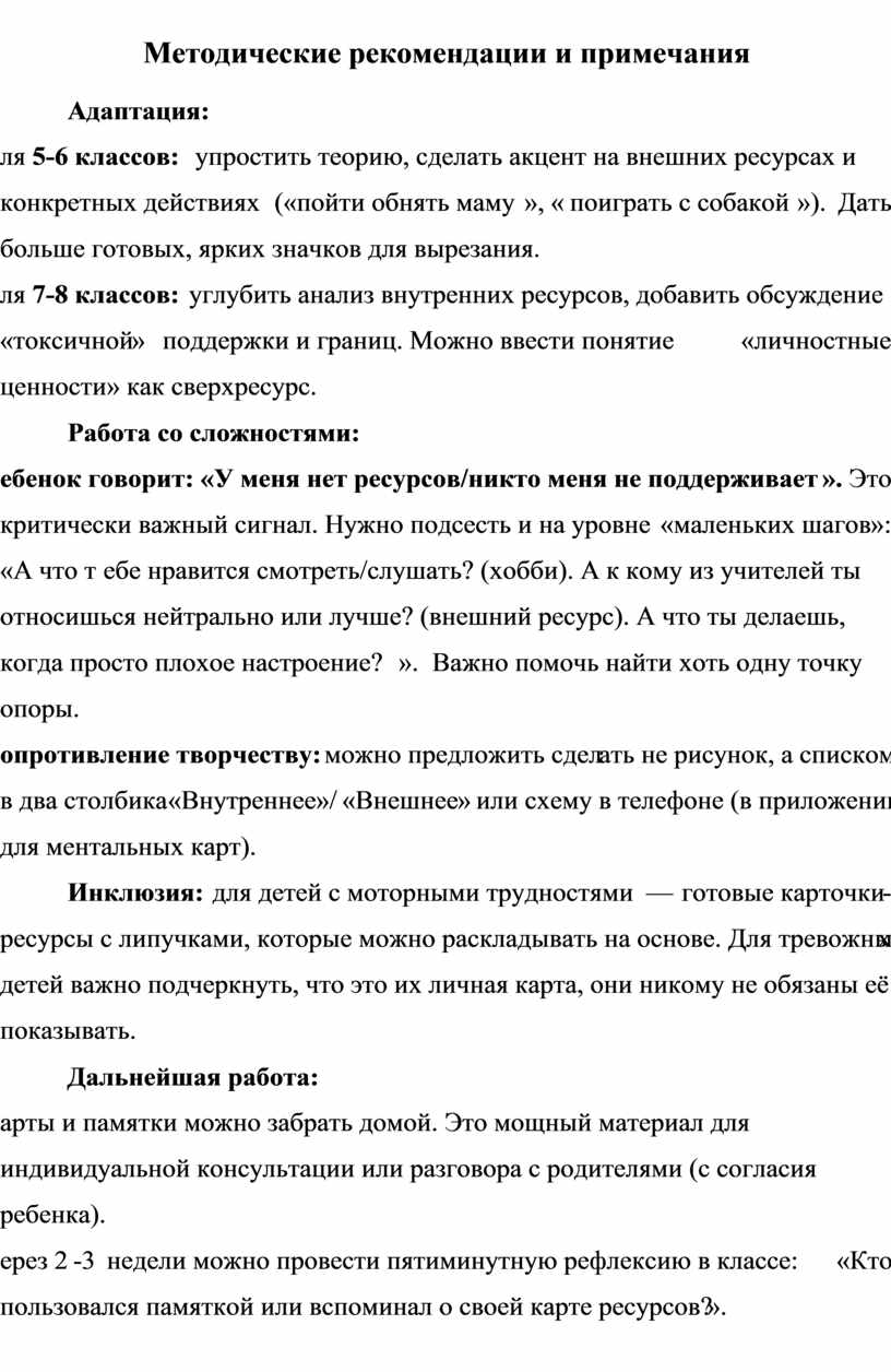 o Для 7-8 классов: углубить анализ внутренних ресурсов, добавить обсуждение «токсичной» поддержки и границ. Можно ввести понятие «личностные ценности» как сверхресурс.