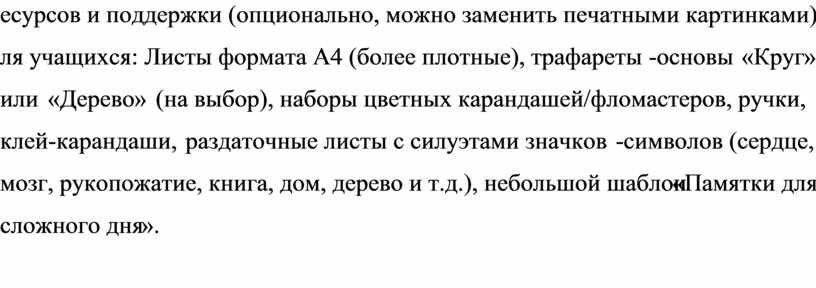 o Для учащихся: Листы формата А4 (более плотные), трафареты-основы «Круг» или «Дерево» (на выбор), наборы цветных карандашей/фломастеров, ручки, клей-карандаши, раздаточные листы с силуэтами значков-символов (сердце, мозг, рукопожатие, книга, дом, дерево и т.д.), небольшой шаблон «Памятки для сложного дня».