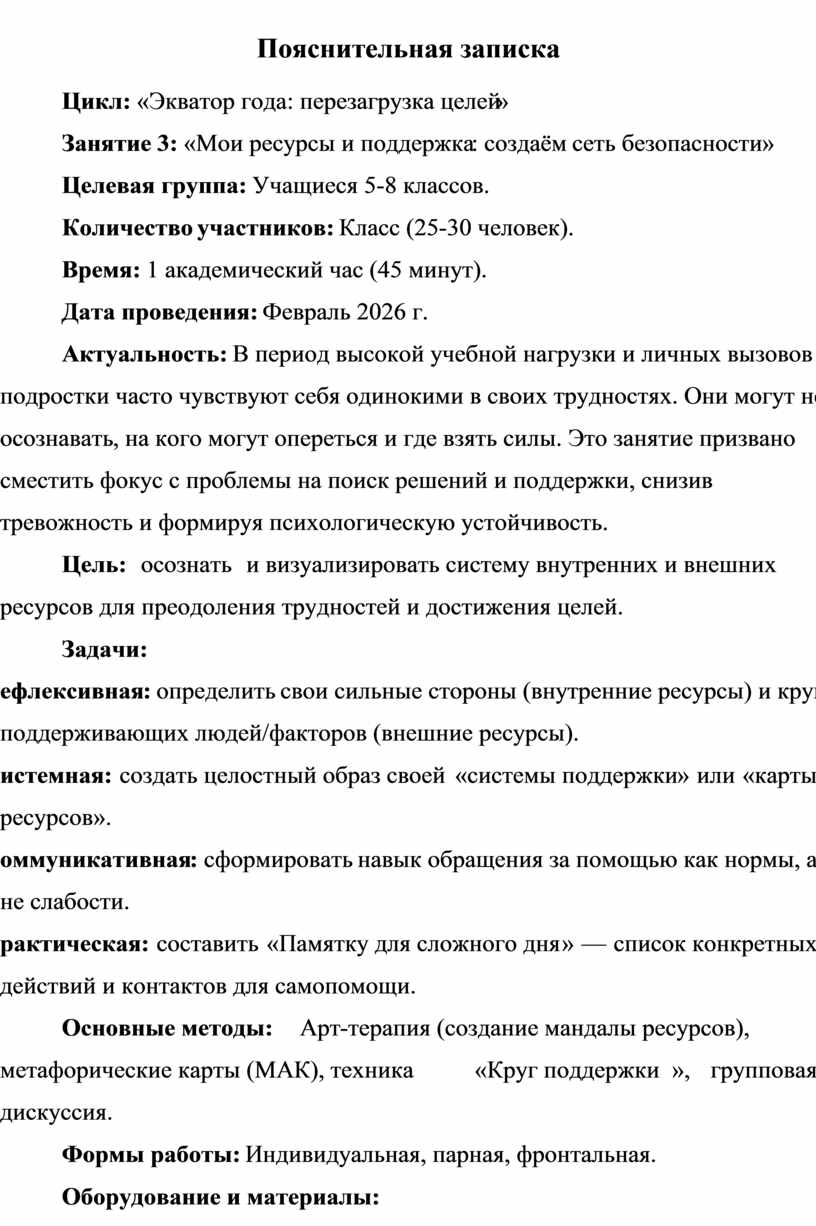 Актуальность: В период высокой учебной нагрузки и личных вызовов подростки часто чувствуют себя одинокими в своих трудностях. Они могут не осознавать, на кого могут опереться и где взять силы. Это занятие призвано сместить фокус с проблемы на поиск решений и поддержки, снизив тревожность и формируя психологическую устойчивость.