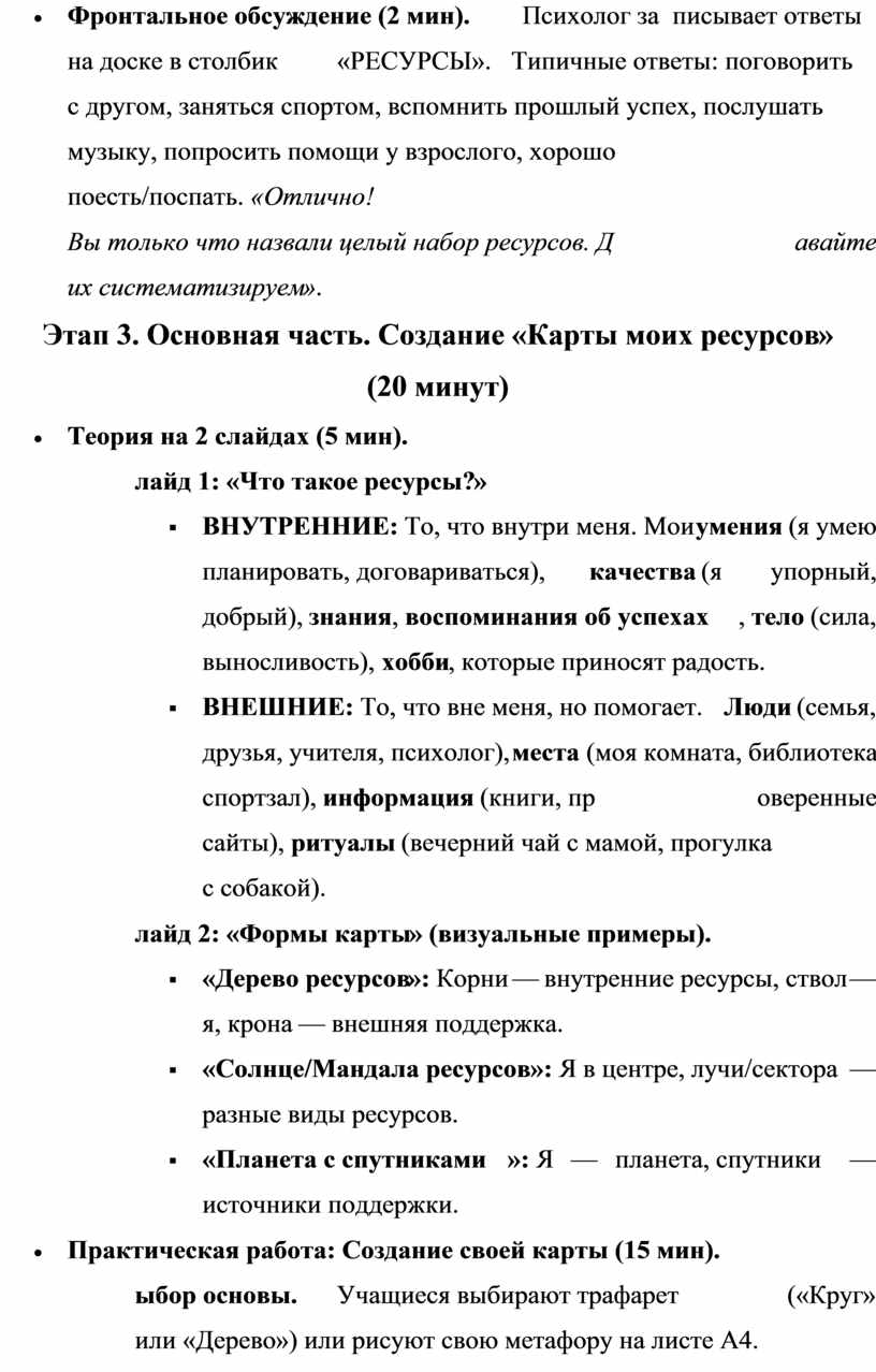 o Для педагога: Ноутбук, проектор, презентация, музыкальная колонка, пример «Карты ресурсов», метафорические карты с изображениями ресурсов и поддержки (опционально, можно заменить печатными картинками).