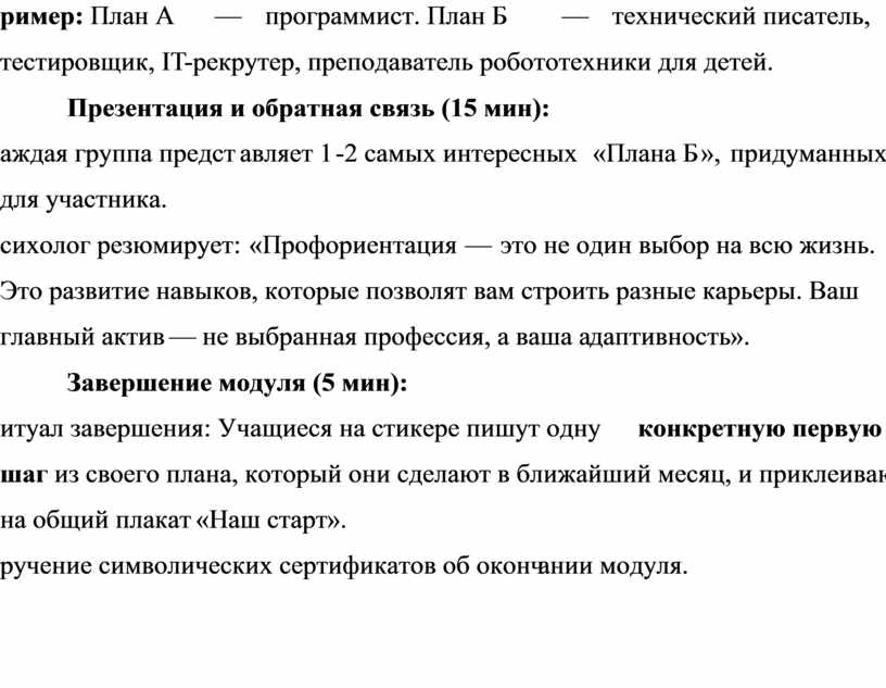 o Задание: у одного участника группы зачитывается его «План А». Задача команды — за 10 минут придумать для него 2-3 реалистичных «Плана Б», если что-то пойдёт не так (не поступил, разочаровался в профессии, появилась новая возможность). Акцент на том, что «План Б» — не провал, а альтернативный интересный путь.
