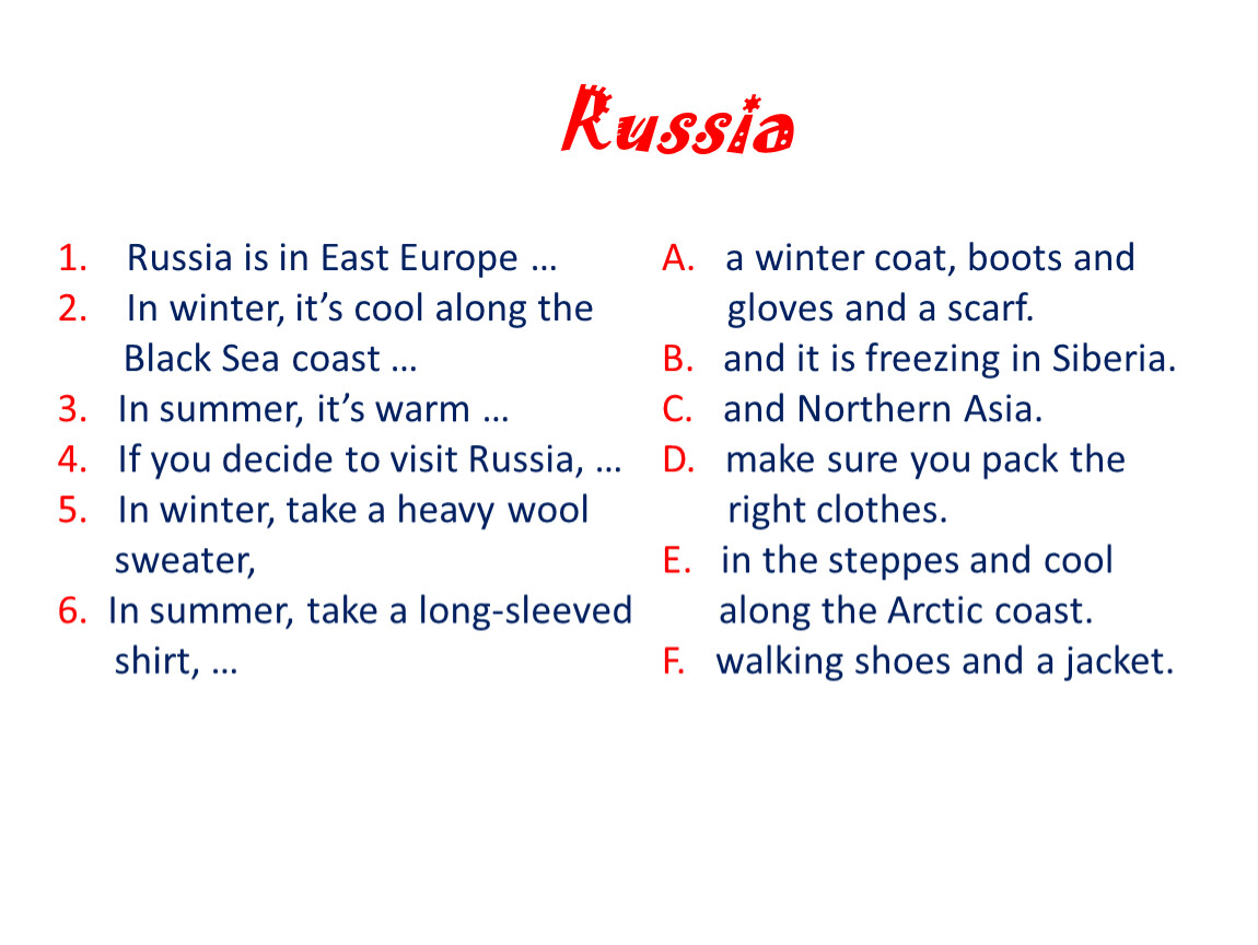 1.    Russia is in East Europe …  | A.   a winter coat, boots and   |