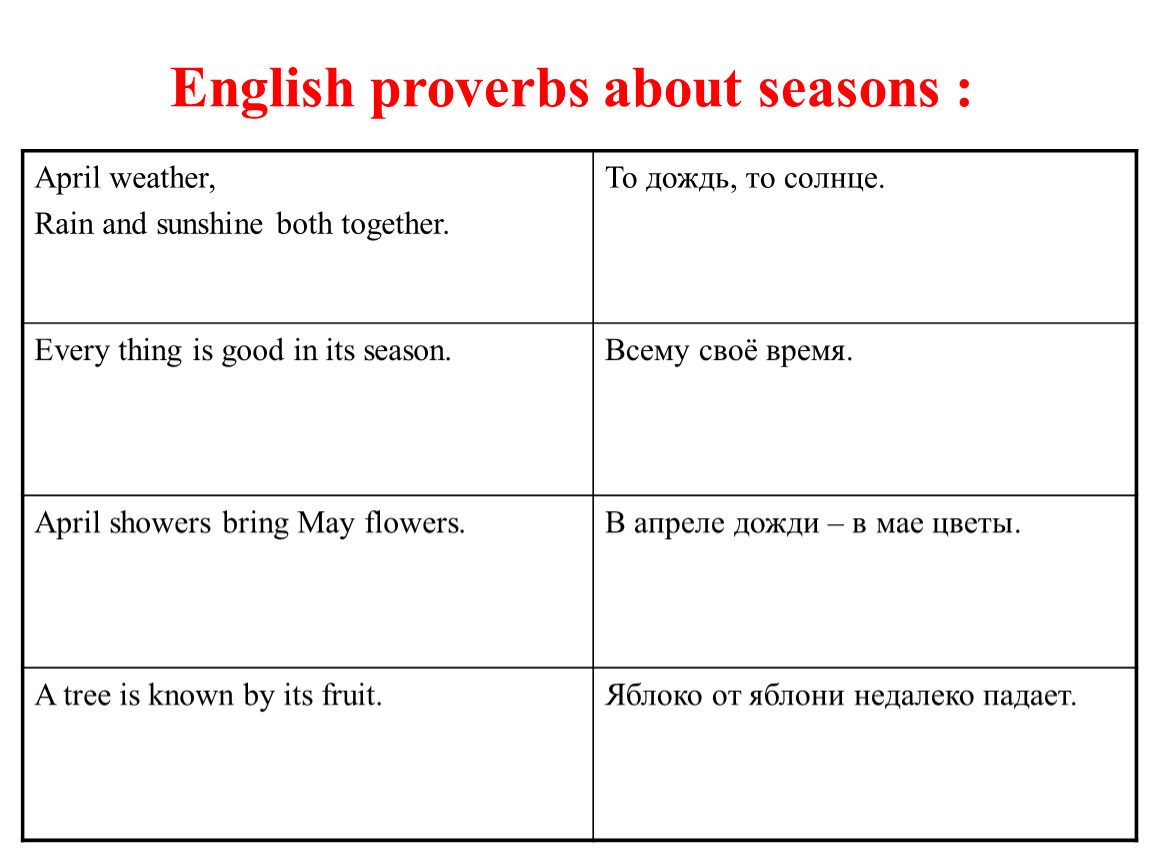 April showers bring May flowers.  | В апреле дожди – в мае цветы.  |
