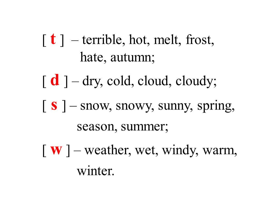 [ t ]  – terrible, hot, melt, frost, 		   hate, autumn;