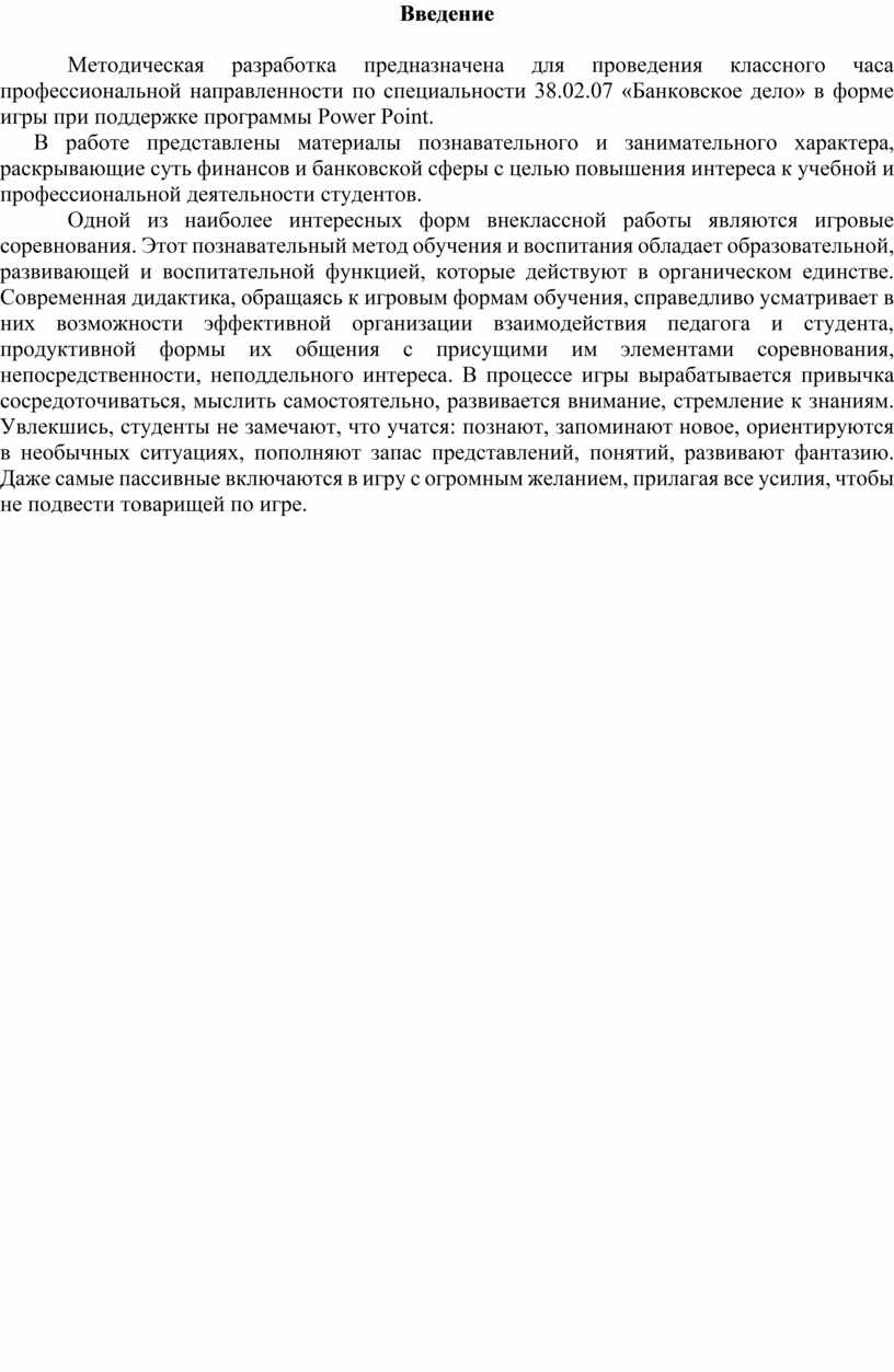 Методическая разработка предназначена для проведения классного часа профессиональной направленности по специальности 38.02.07 «Банковское дело» в форме игры при поддержке программы Power Point.