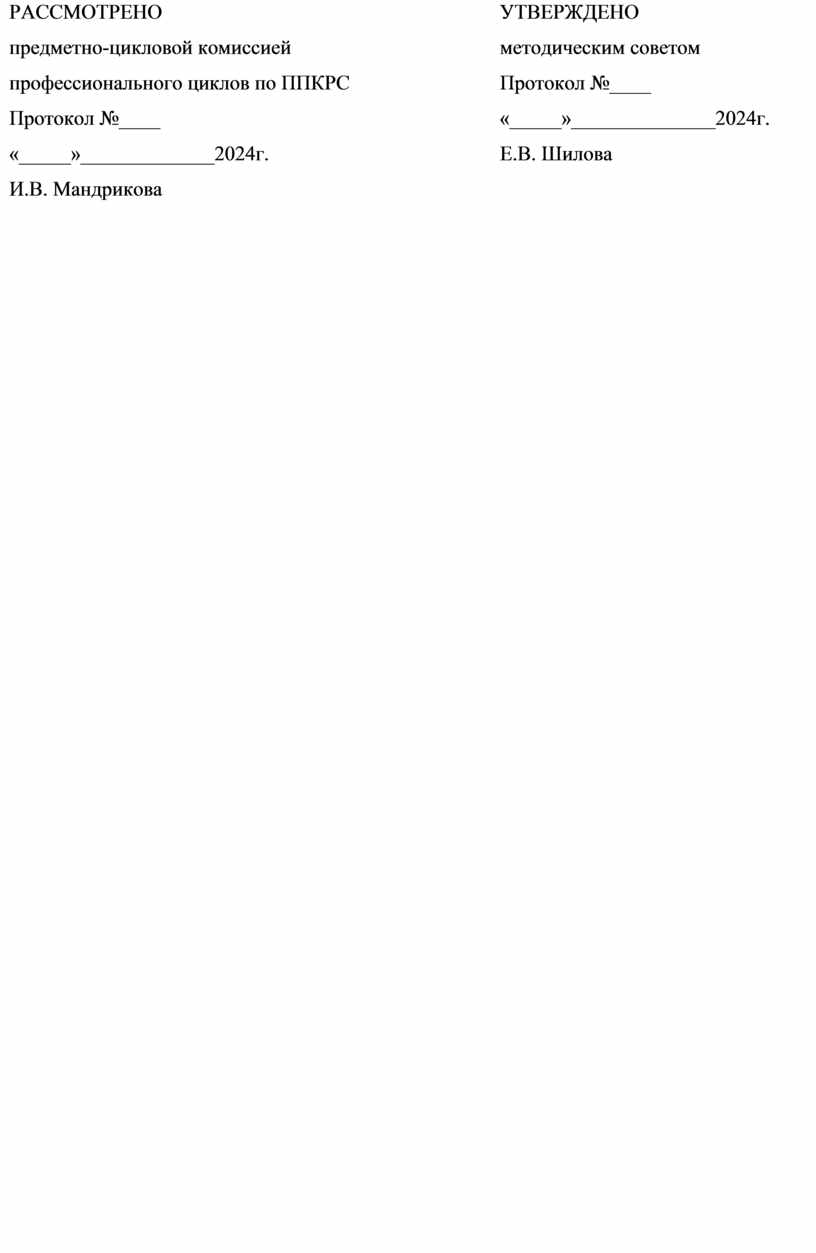 РАССМОТРЕНО предметно-цикловой комиссией профессионального циклов по ППКРС Протокол №____ «_____»_____________2024г. И.В. Мандрикова |