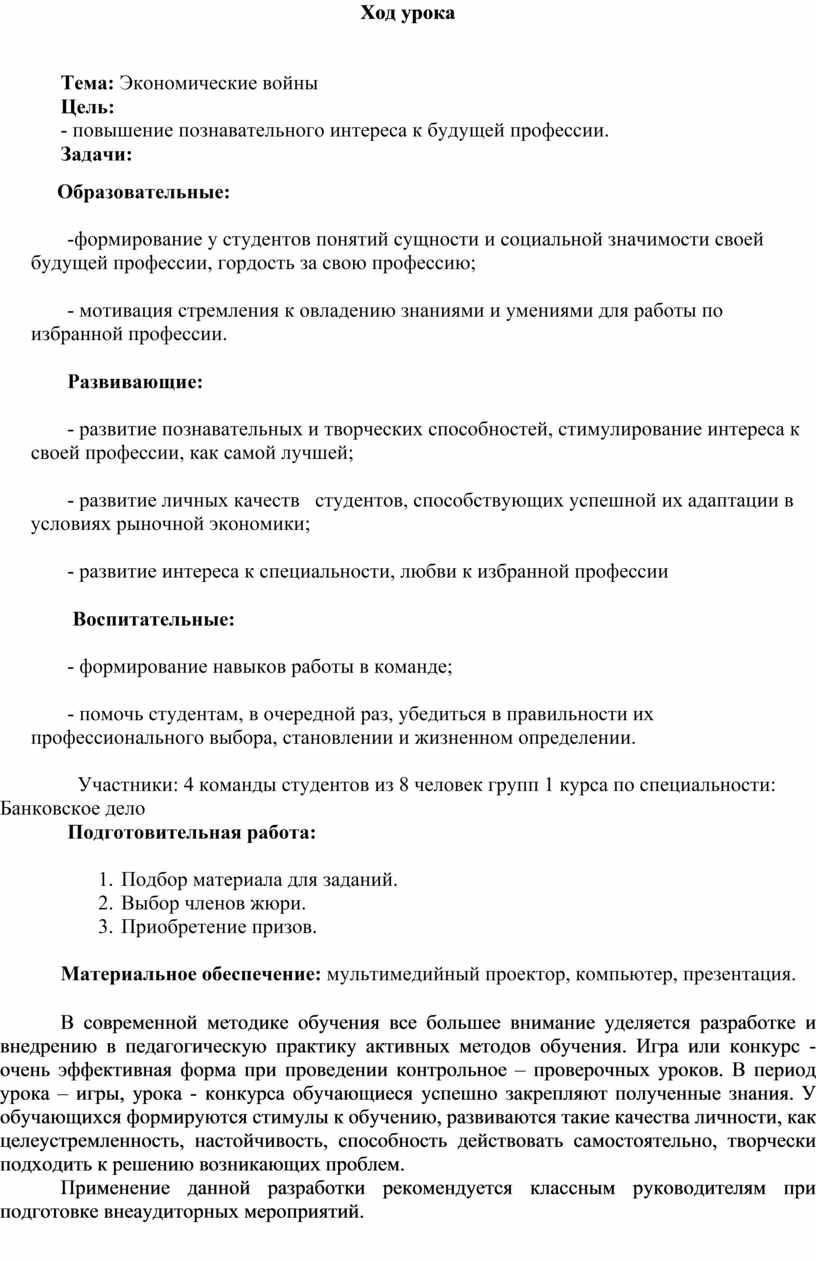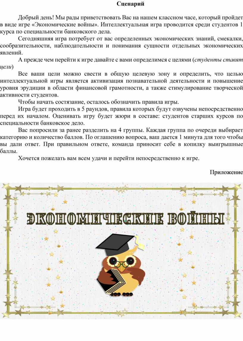 Добрый день! Мы рады приветствовать Вас на нашем классном часе, который пройдет в виде игре «Экономические войны». Интеллектуальная игра проводится среди студентов 1 курса по специальности банковского дела.