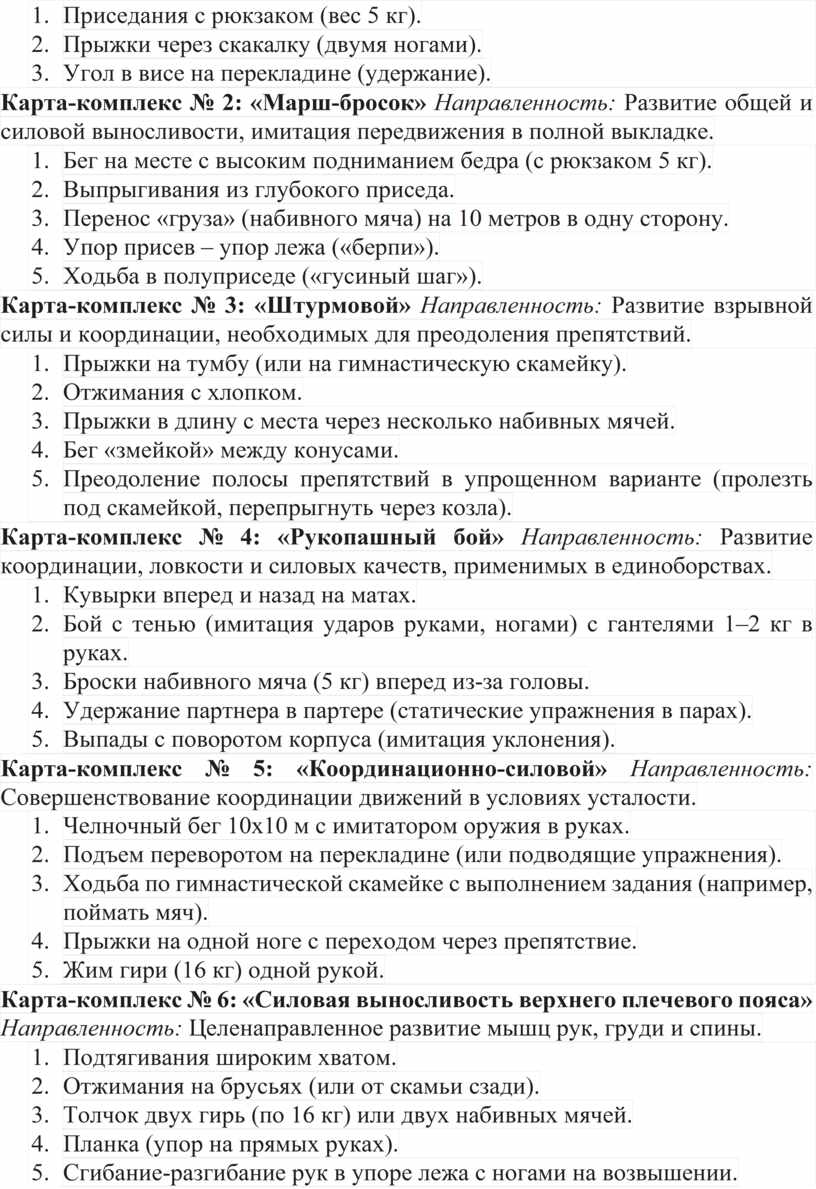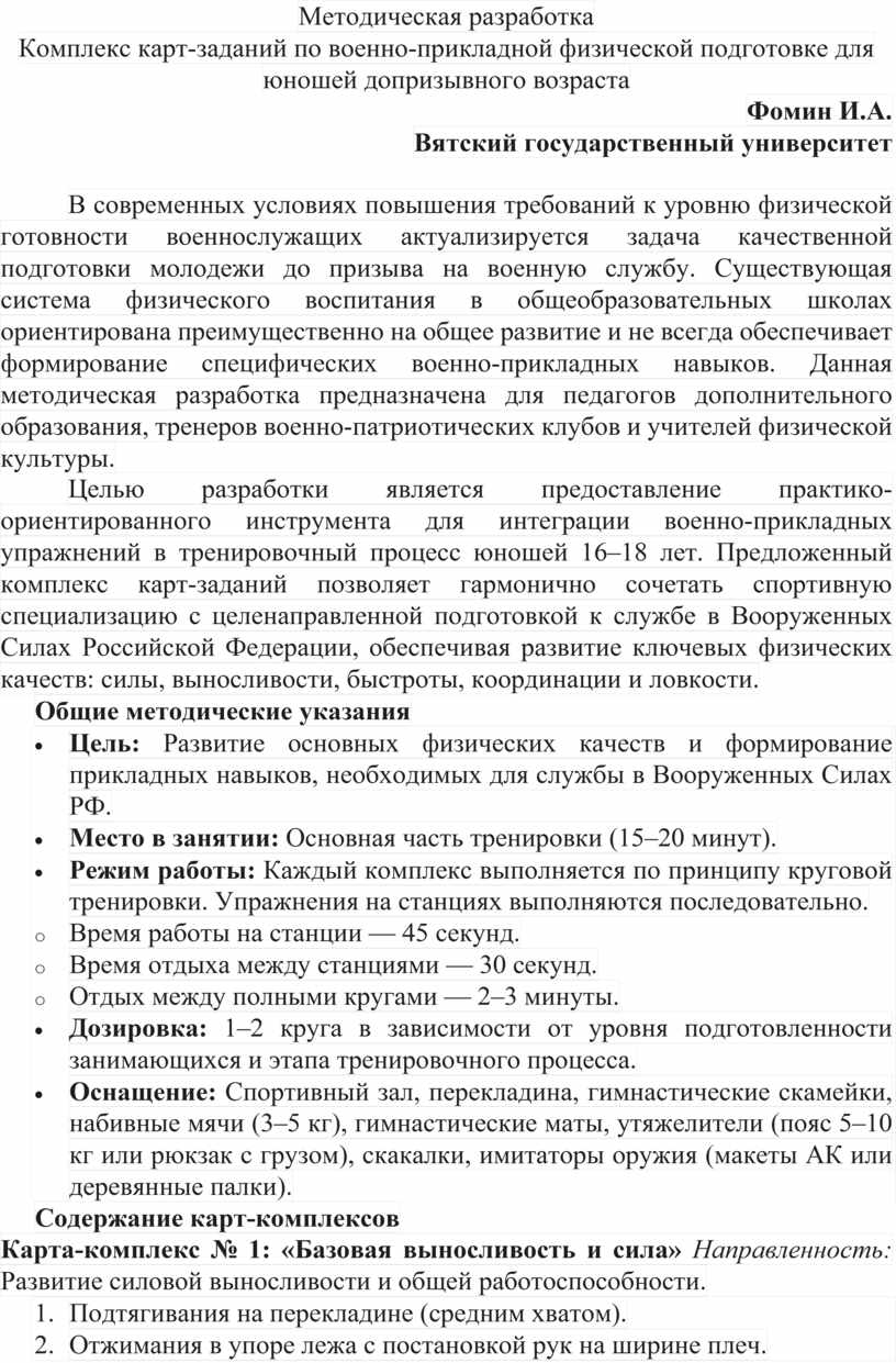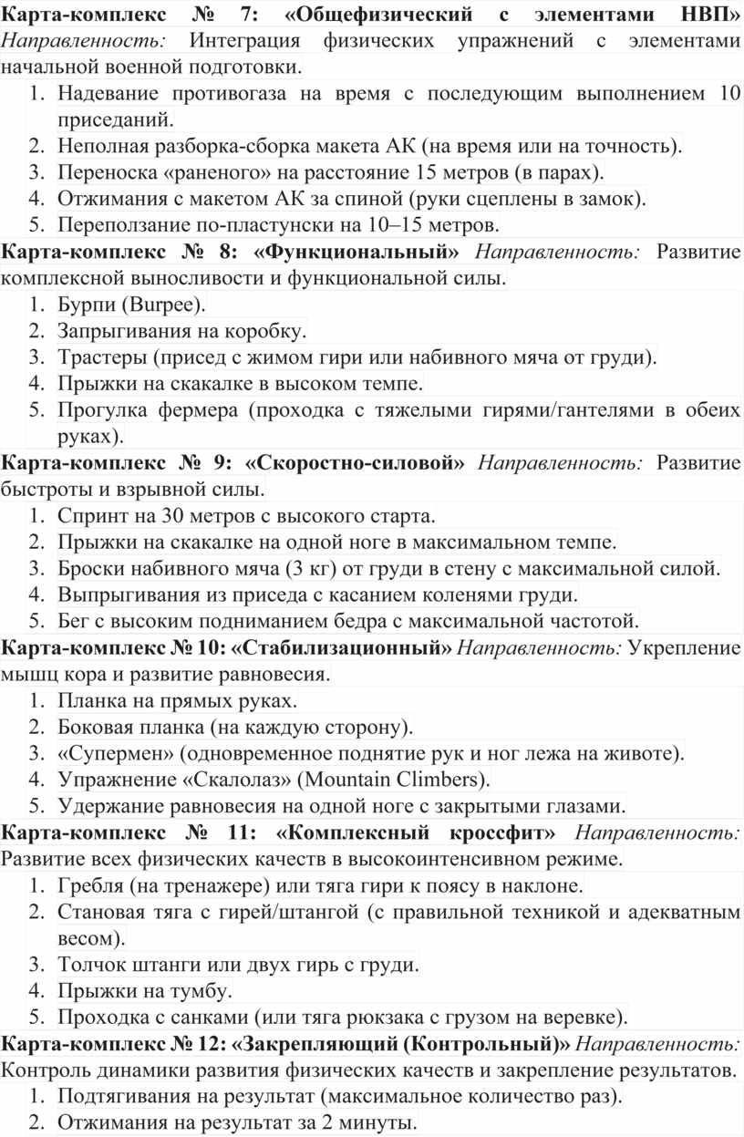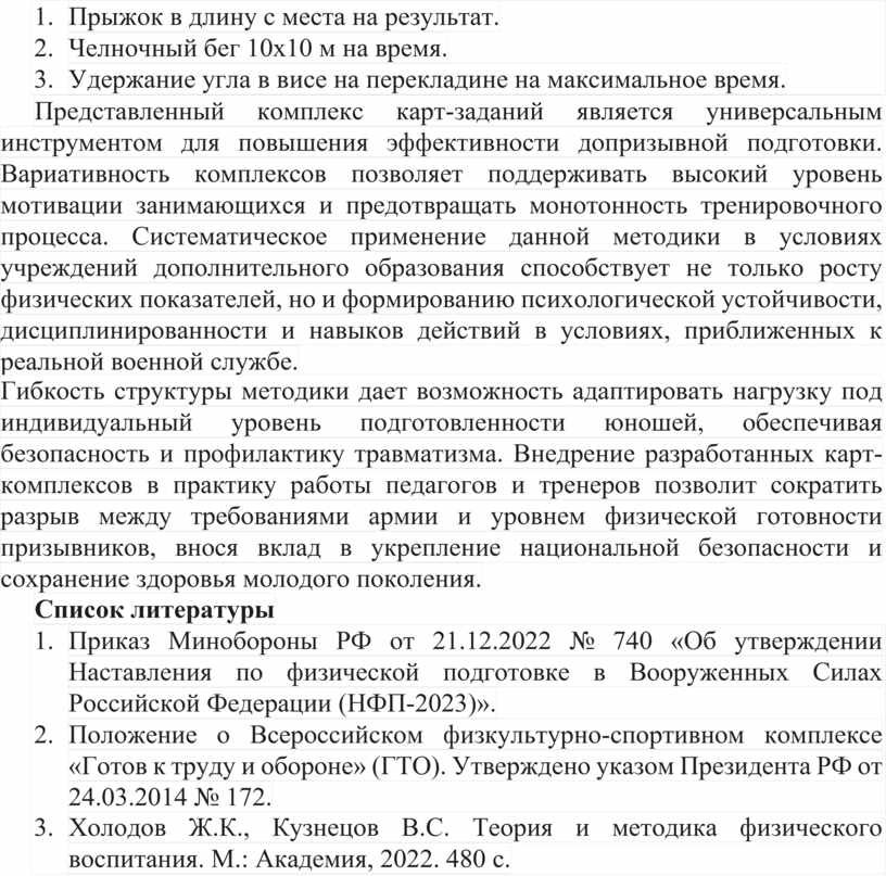 Представленный комплекс карт-заданий является универсальным инструментом для повышения эффективности допризывной подготовки. Вариативность комплексов позволяет поддерживать высокий уровень мотивации занимающихся и предотвращать монотонность тренировочного процесса. Систематическое применение данной методики в условиях учреждений дополнительного образования способствует не только росту физических показателей, но и формированию психологической устойчивости, дисциплинированности и навыков действий в условиях, приближенных к реальной военной службе.